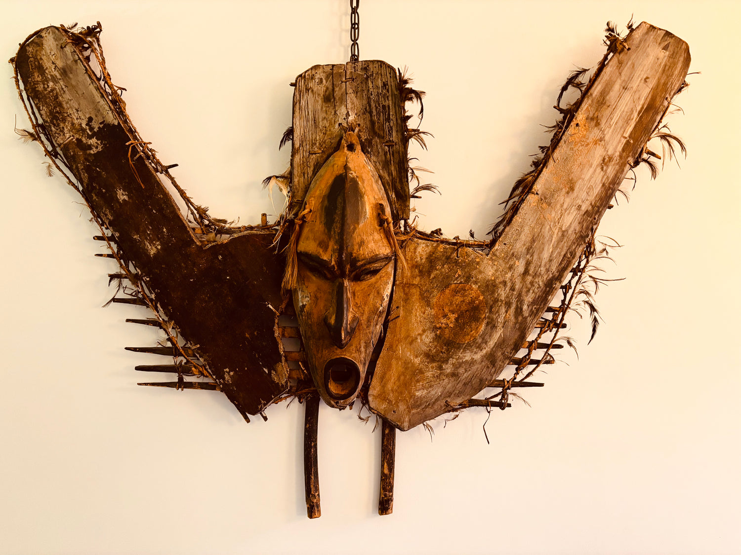 This would be an actual canoe prow and not one made for the tourist industry. Probably first part of 20th c. It is from the region of the Sepik River. The feathers are those of the Cassowary. A bird much revered by this culture.The fierce aspect wards off enemies and evil water spirits.
