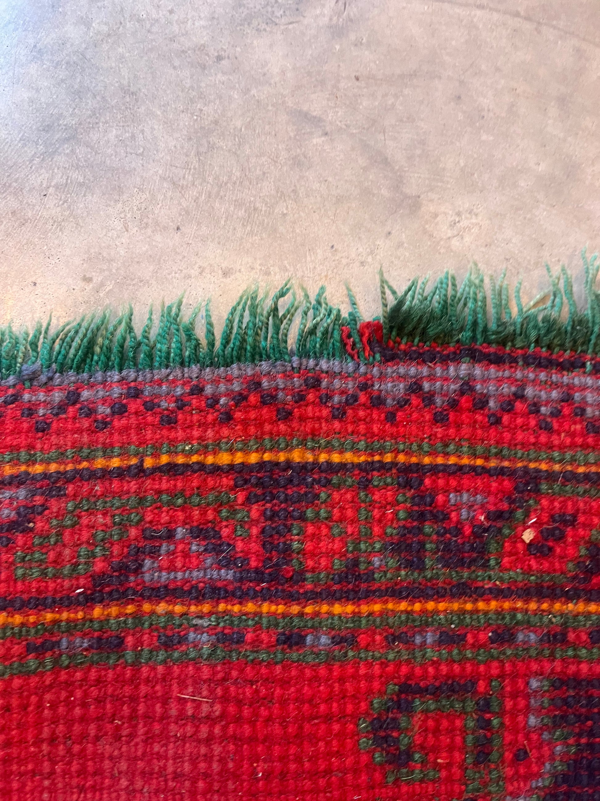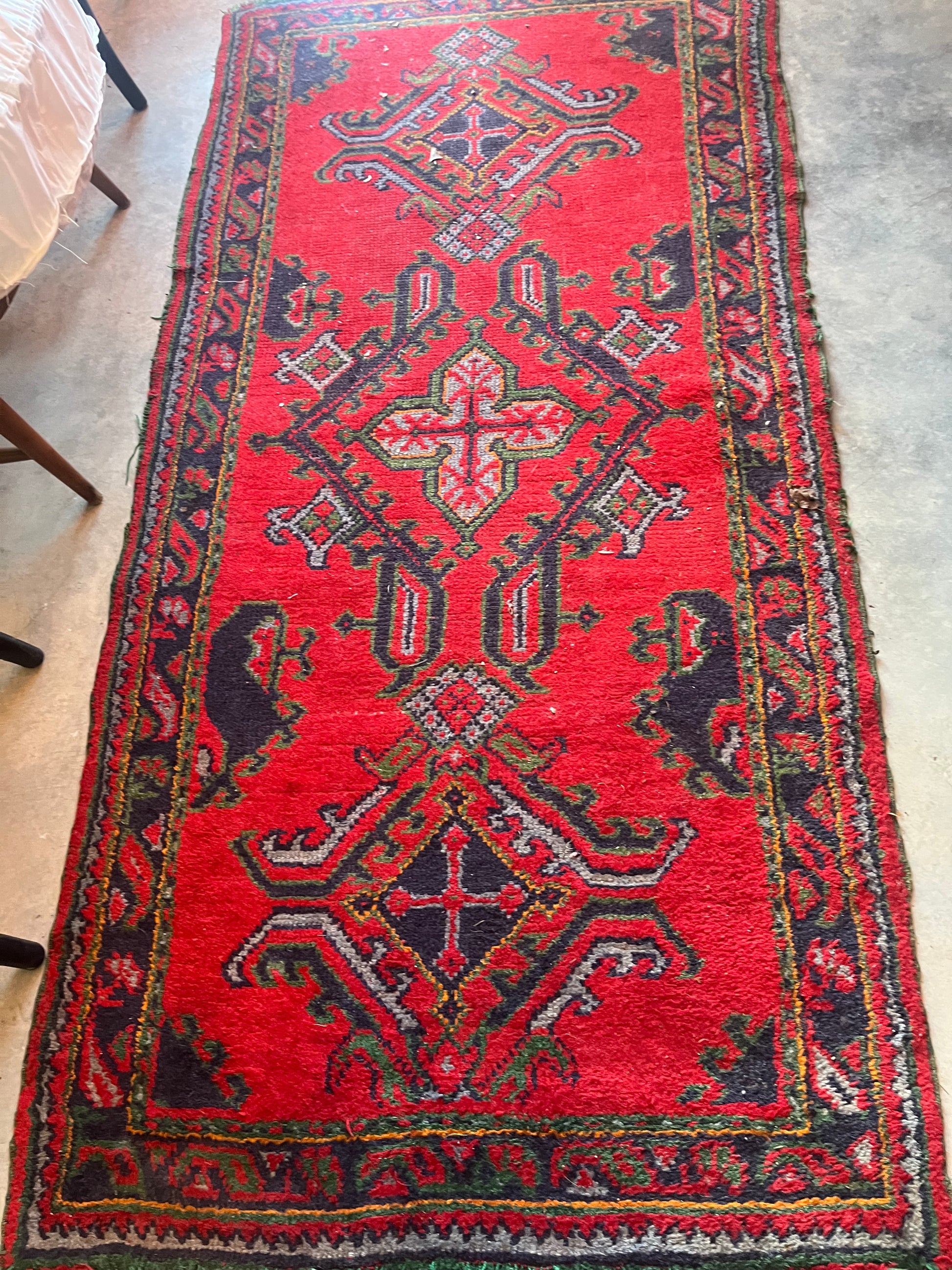 his is a hand-knotted Turkish Oushak wool runner rug with a vibrant red field and geometric tribal designs in black, green, and blue.